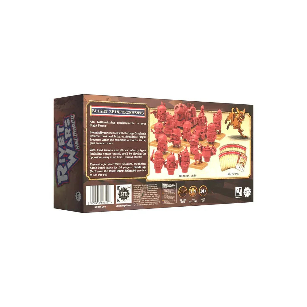 Egészítsd ki a Blight Forces harckocsidat csatát hozó erősítésekkel ezzel a Rivet Wars: Reloaded kiegészítővel! Gőzöld meg ellenségeidet a hatalmas Griffkalapács tankkal, és hozd szembe a félelmetes Plague Troopers-vel Doctor Vorne parancsnoksága alatt, és még sok minden mást!