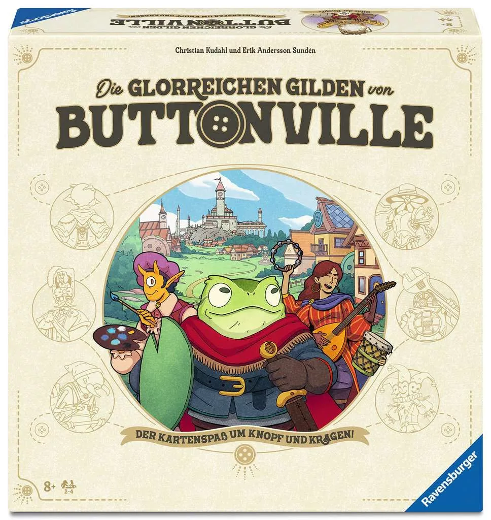 Das Dorf Buttonville ist zweifellos das glorreichste Dorf aller Zeiten. Es gibt jedoch ein kleines Problem: Es gibt dort niemanden! Begegne den glorreichen Gilden in der Umgebung, rekrutiere glorreiche Individuen mit unglaublichen Fähigkeiten und lass deinen Stadtteil von Buttonville gedeihen, um unvergleichlichen Ruhm zu erlangen!Die Glorreichen Gilden von Buttonville ist ein Kartenspiel für 2 bis 4 Spieler ab 8 Jahren. Rekrutiere so viele Dorfbewohner wie möglich und nutze deren Fähigkeiten. In deinem Zug rekrutierst du 2 Dorfbewohner vom Markt oder vom Nachziehstapel und dann kannst du mehrere Karten desselben Dorfbewohners spielen, die ein Set bilden. Die meisten Dorfbewohner haben unglaubliche Fähigkeiten. Manchmal wird die Wirkung stärker, je mehr identische Dorfbewohner du im Set spielst. Am Ende bringt dir jedes Set Dorfbewohner-Siegespunkte, basierend auf der Anzahl der Dorfbewohner in jedem deiner Sets. Spiele deine Karten geschickt, um das Spiel zu gewinnen!